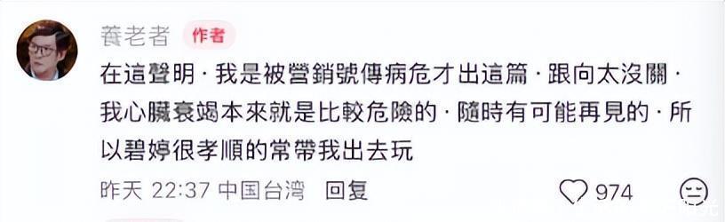还不满70岁的郭爸向来爱开玩笑,和郭碧婷上节目时的冷幽默圈粉无数,如此公开喊话也被网友猜测会不会和向太有关,毕竟说他身体不太好的消息是从向太视频中传出来的。14日深夜,郭爸为了网络上的谣言,在评论区郑重声明“我是被营销号传病危才出这篇,跟向太没关,我心脏衰竭本来就是比较危险的,随时有可能再见的,所以碧婷很孝顺的常带我出去玩”,或许是网络上的流言蜚语已经转变风向,所以郭爸才不得已又来声明,为了澄清和向太没有关系。